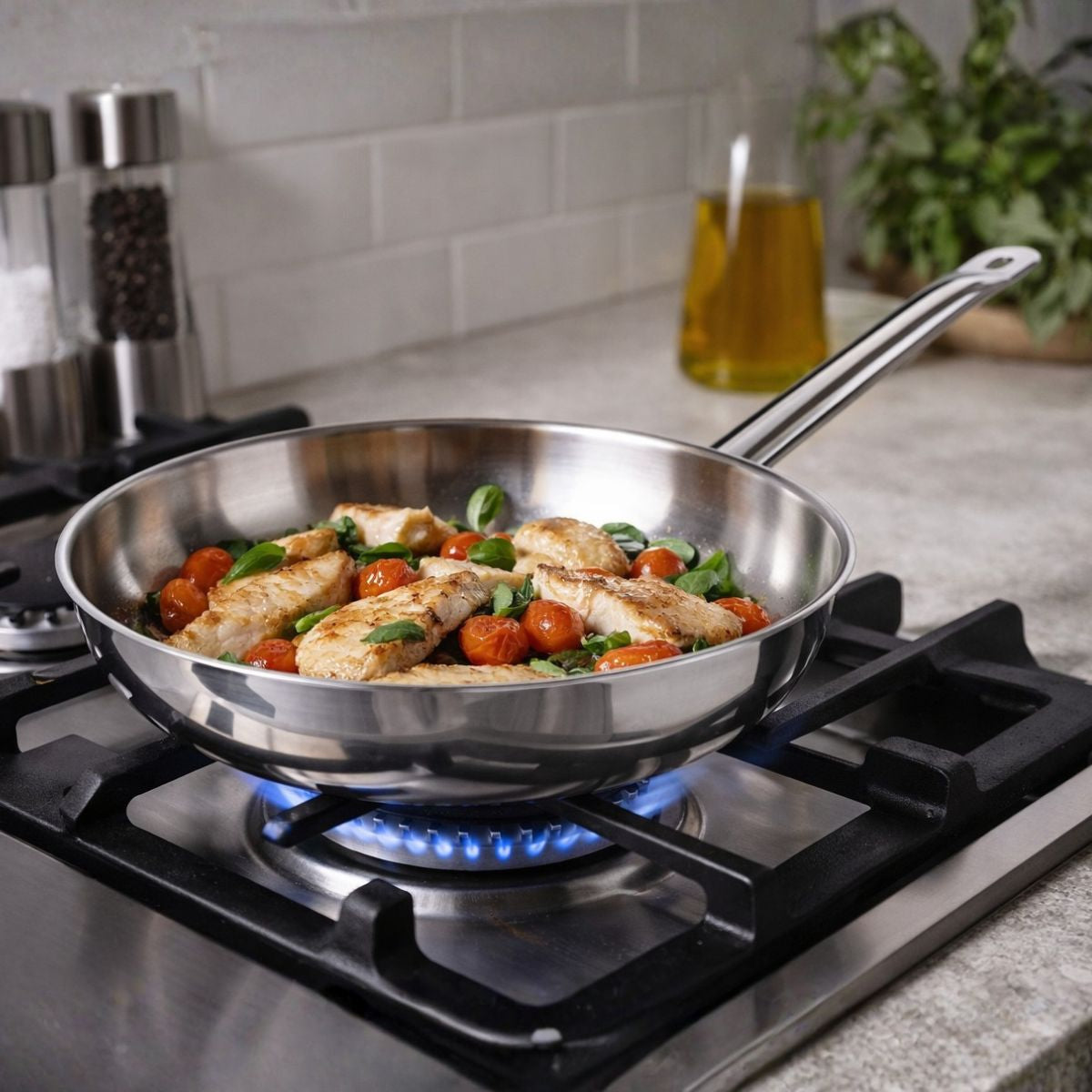 Con las sartenes de acero inoxidable Monix cocinas como un profesional. Gracias a su construcción resistente y distribución uniforme del calor, se obtienen resultados perfectos al sellar, dorar o saltear tus platos favoritos. Apuesta por una herramienta de cocina que dura mucho más.